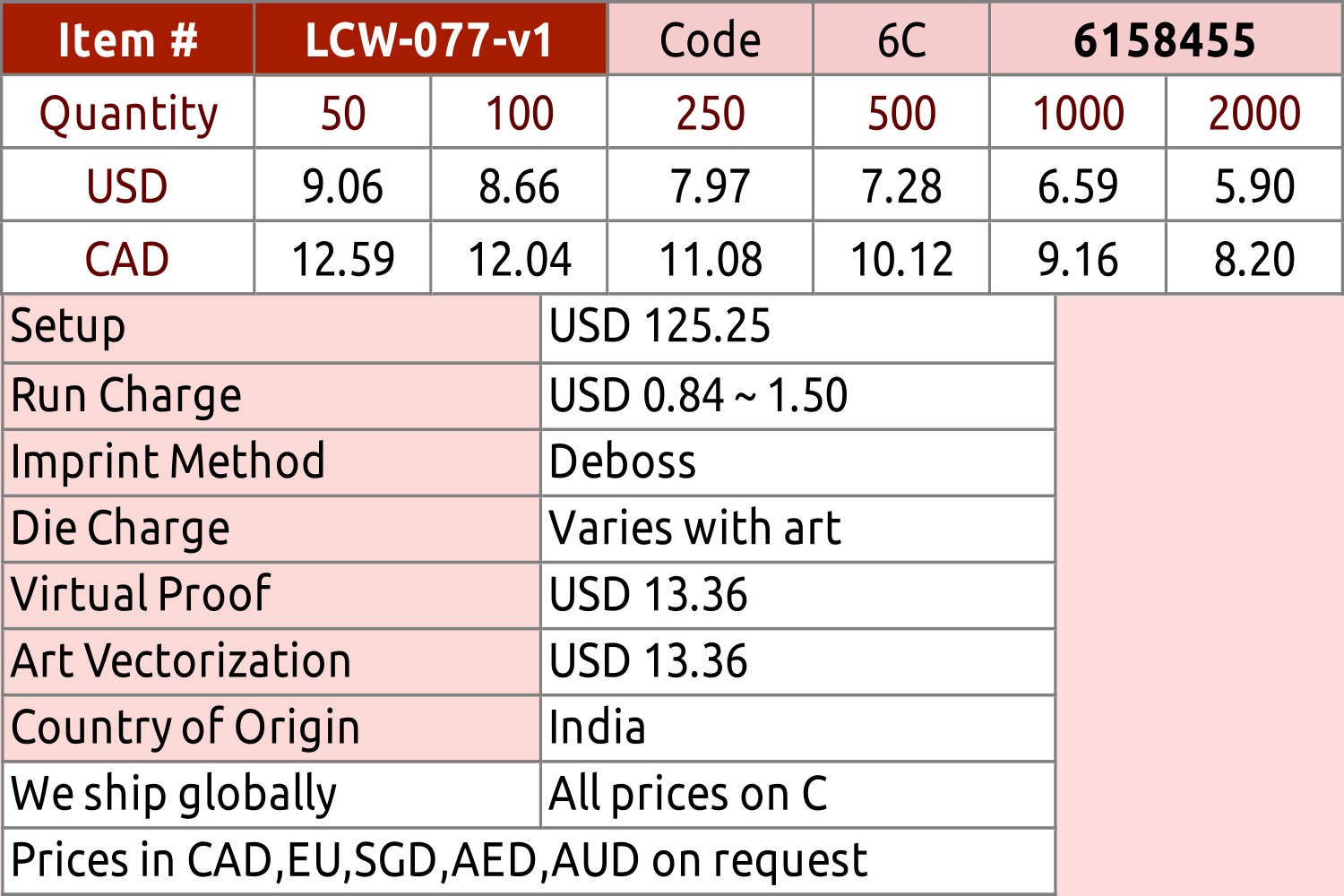 Imprint Method: Deboss (Recommended), Laser Engraving.