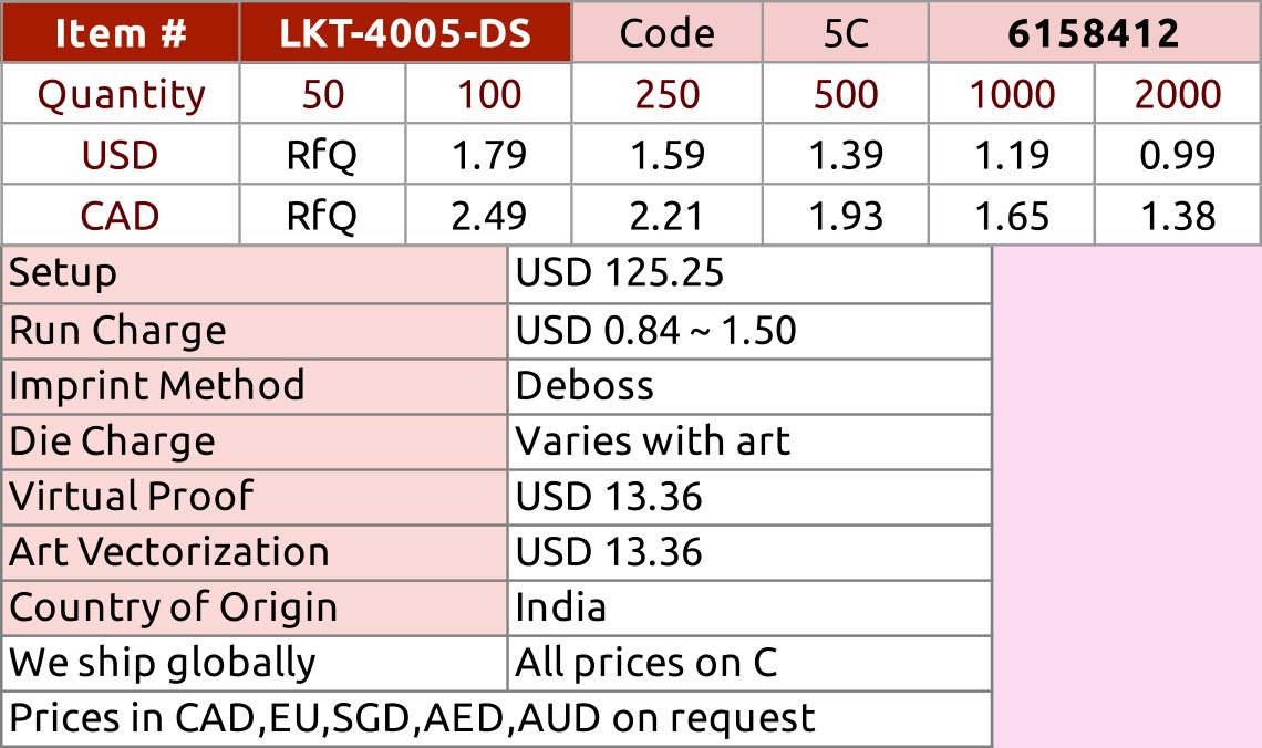 Imprint Size: 0.78 Wx1.96 H inch.2.00 Wx5.00 H cm.