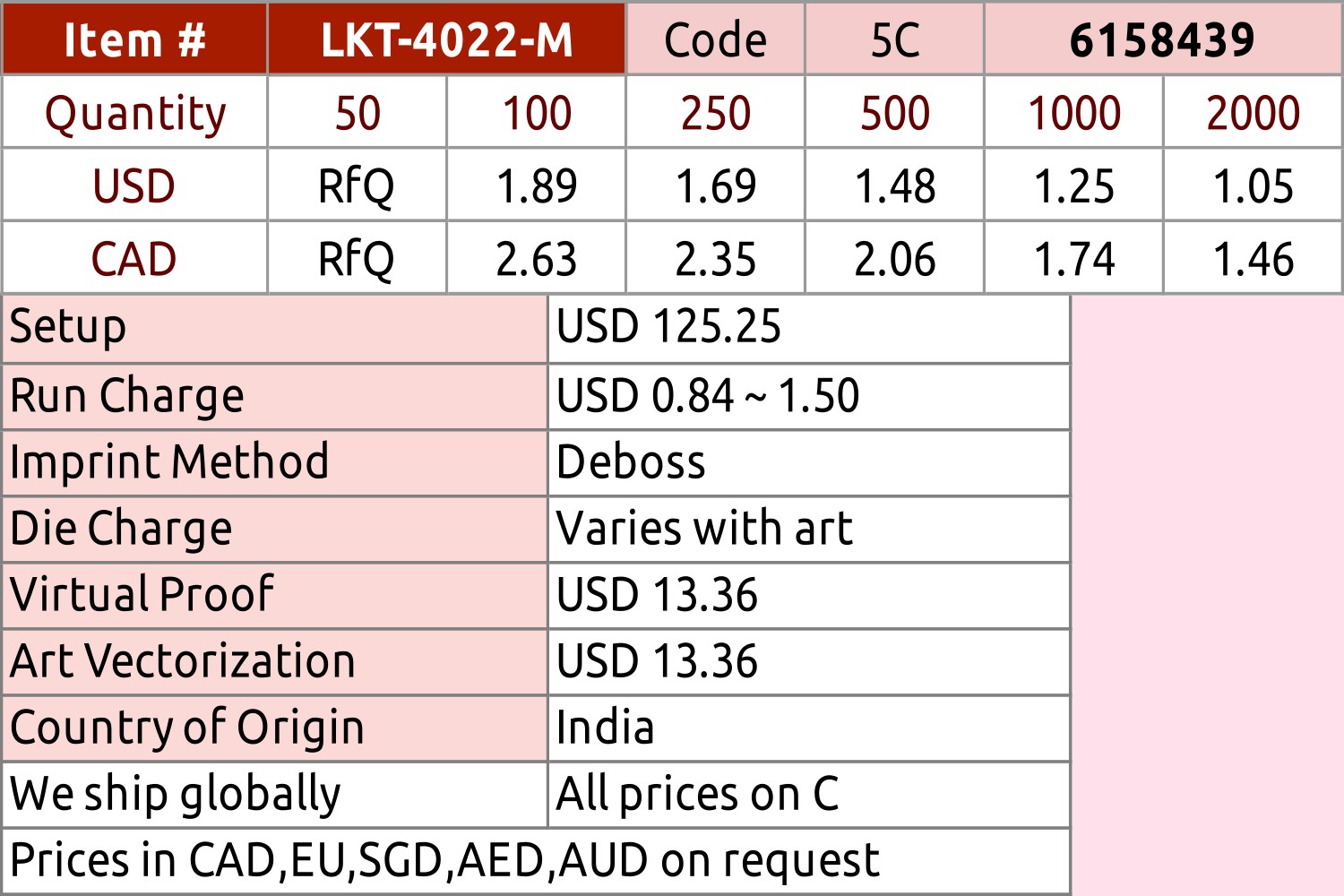 Imprint Size: 0.98 Wx1.96 H inch.2.50 Wx5.00 H cm.