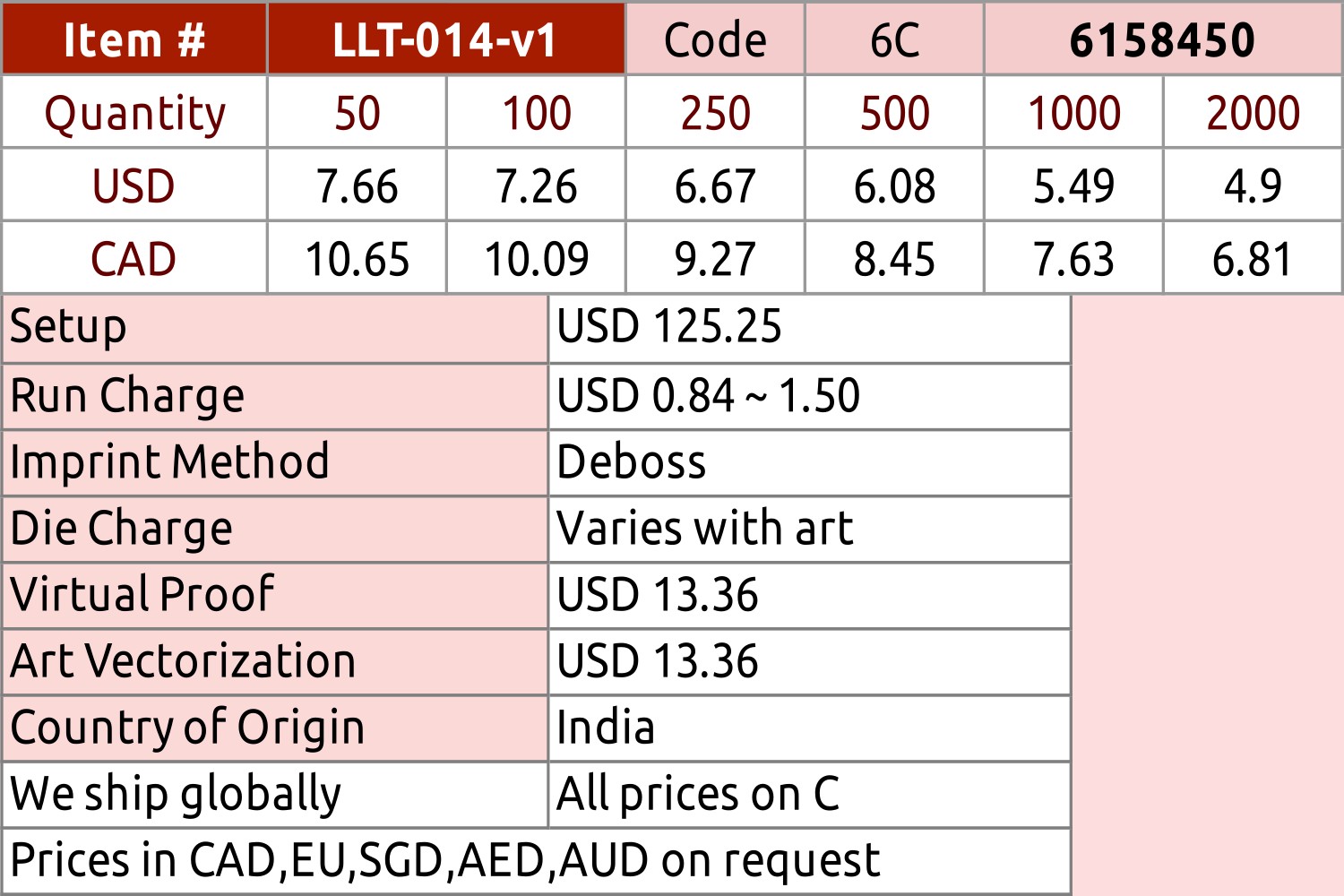 Imprint Method: Deboss (Recommended), Laser engraving.