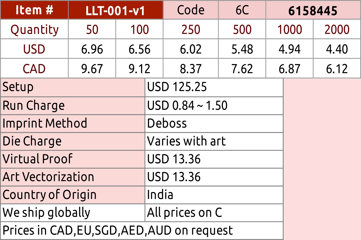 Imprint Method: Deboss (Recommended), Laser engraving.